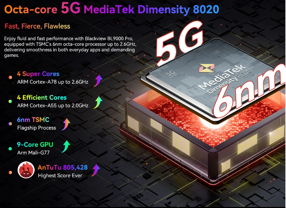 Uživajte v tekočem in hitrem delovanju z Blackview BL9000 Pro, opremljenim s 6nm osemjedrnim procesorjem TSMC do 2,6 GHz, ki zagotavlja gladkost tako v vsakodnevnih aplikacijah kot v zahtevnih igrah.