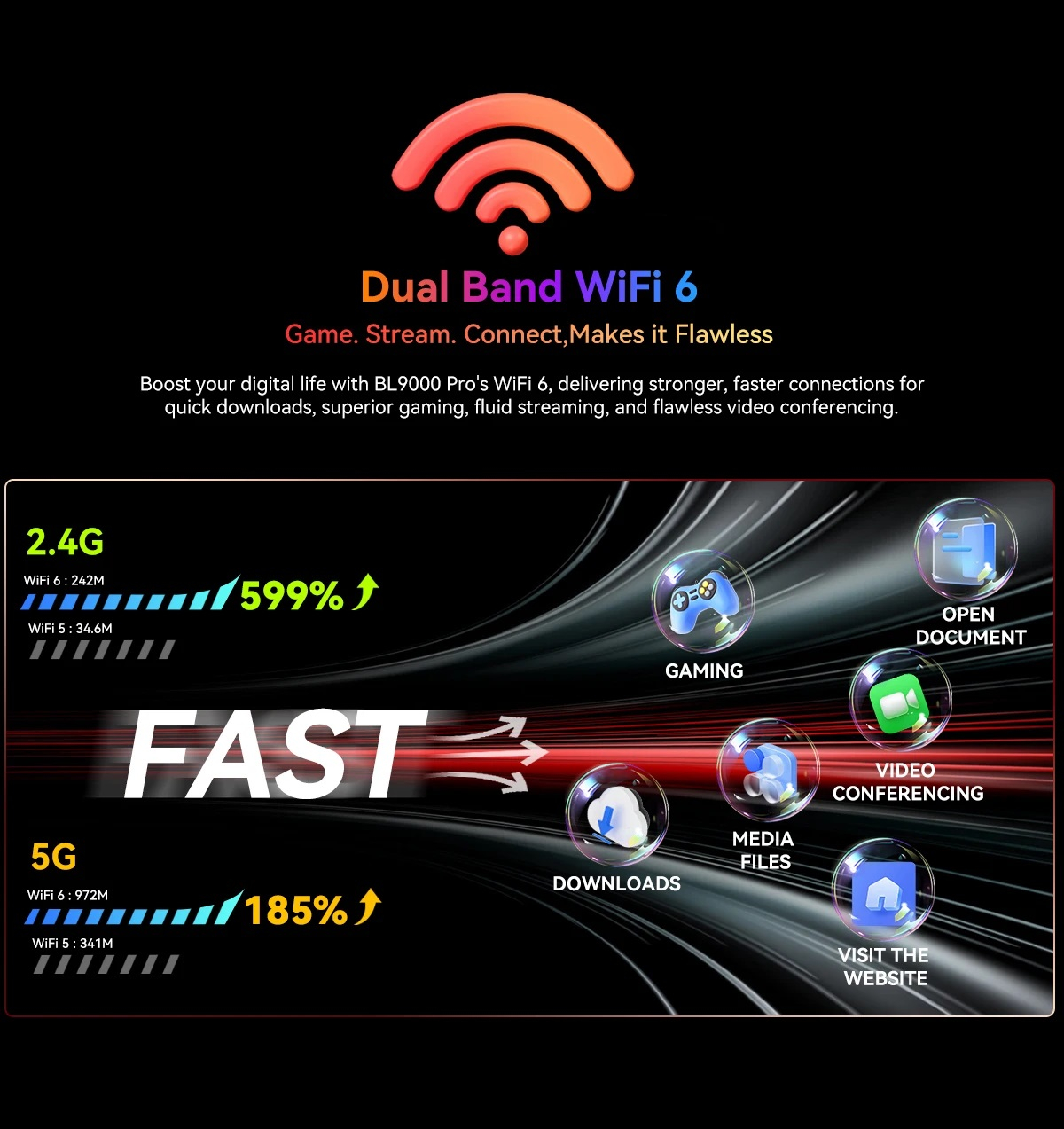 Izboljšajte svoje digitalno življenje z WiFi 6 BL9000 Pro, ki zagotavlja močnejše in hitrejše povezave za hitre prenose, vrhunsko igranje, tekoče pretakanje in brezhibne videokonference.
