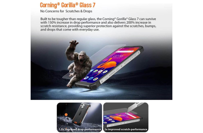 Steklo Corning® Gorilla® Glass 7 je izdelano tako, da je trdnejše od običajnega stekla, lahko preživi s 150-odstotnim povečanjem zmogljivosti pri padcih in zagotavlja tudi 200-odstotno povečanje odpornosti proti praskam, kar zagotavlja vrhunsko zaščito pred praskami, udarci in padci, ki jih spremlja vsakodnevna uporaba.