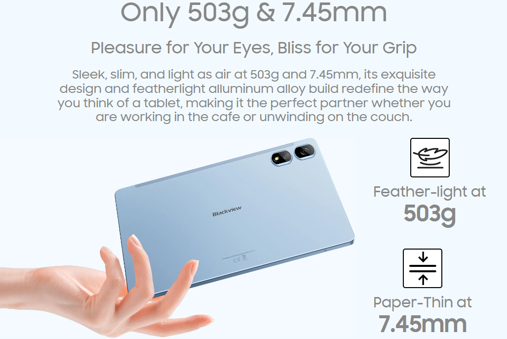 Eleganten, tanek in lahek kot zrak s 503 g in 7,45 mm, njegova izvrstna zasnova in peresno lahka zgradba iz aluminijeve zlitine na novo definirata vaš pogled na tablični računalnik, zaradi česar je popoln partner ne glede na to, ali delate v kavarni ali počivate na kavču.