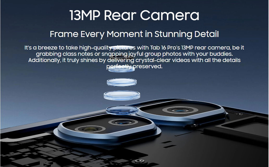 Z zadnjo kamero tablice Tab 16 Pro s 13 milijoni slikovnih pik je enostavno fotografirati visokokakovostne fotografije, pa naj bo to zajemanje zapiskov v razredu ali fotografiranje veselih skupinskih fotografij s prijatelji. Poleg tega resnično blesti z zagotavljanjem kristalno čistih videoposnetkov z vsemi popolnoma ohranjenimi podrobnostmi.