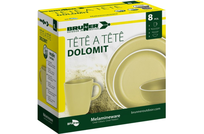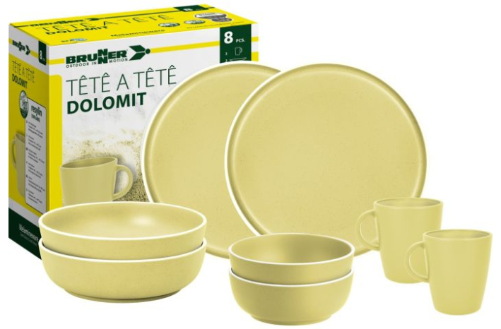 Brunner Tête-à-Tête Dolomit  je visokokakovosten 8-delni komplet posode za dve osebi, zasnovan posebej za uporabo na prostem. Izdelan je iz melamina, ki je znan po svoji trpežnosti in odpornosti na udarce, hkrati pa nudi estetski videz, podoben porcelanu.