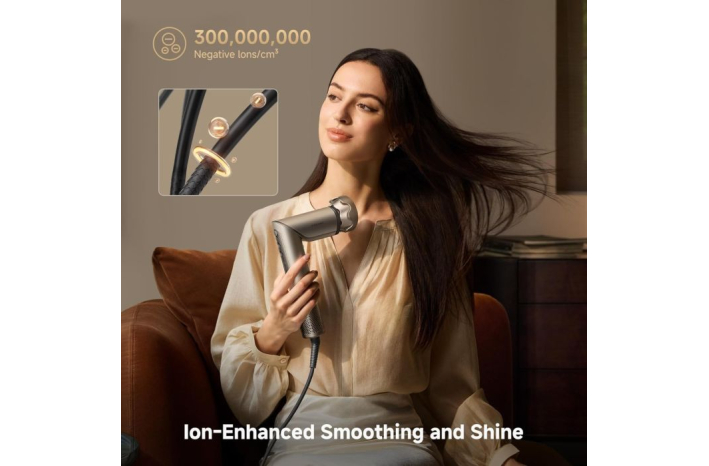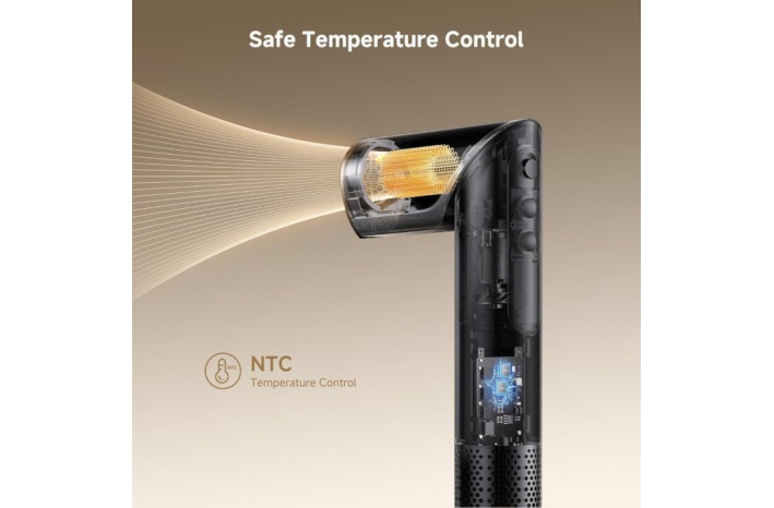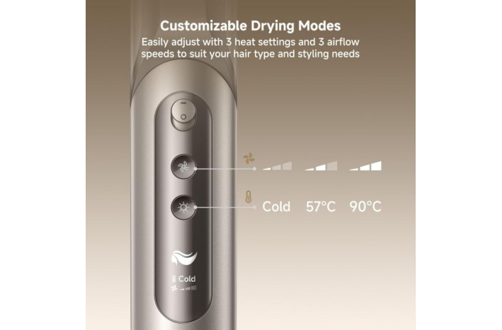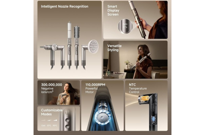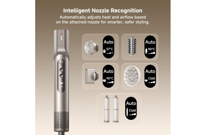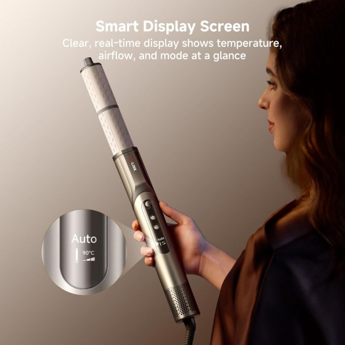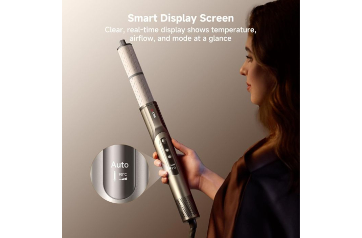 Pametni zaslon za enostavno uporabo: Eleganten digitalni zaslon prikazuje trenutne podatke o temperaturi, hitrosti pretoka zraka in načinu oblikovanja. Z enostavnim gumbom in samodejnim zaznavanjem nastavkov je menjava nastavitev hitra in brez napora.