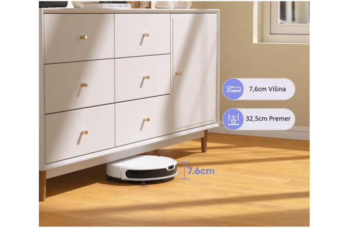 Z višino le 7,6 cm in premerom 32,5 cm je Mova M1 zasnovan za enostavno drsenje pod pohištvom in skozi ozke prostore, tako da ne ostane skrit noben prašni delec.
