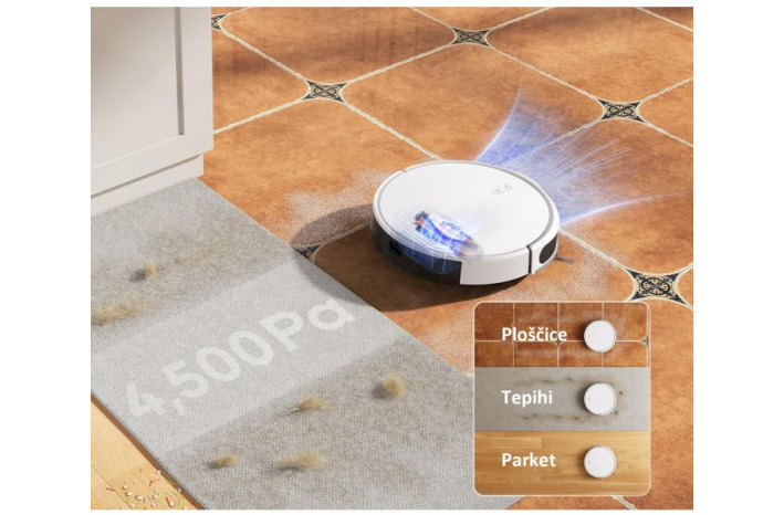 - Povečanje sesalne moči na preprogah: Samodejno poveča sesalno moč, ko zazna površino preproge.