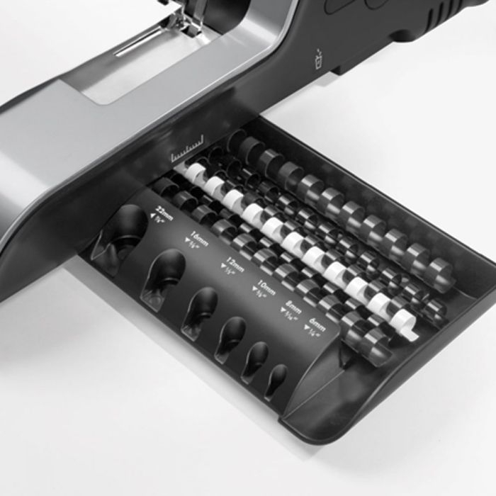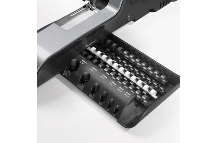 • Predal s patentirano šablono za hitro in primerno izbiro velikosti špiral/platnic