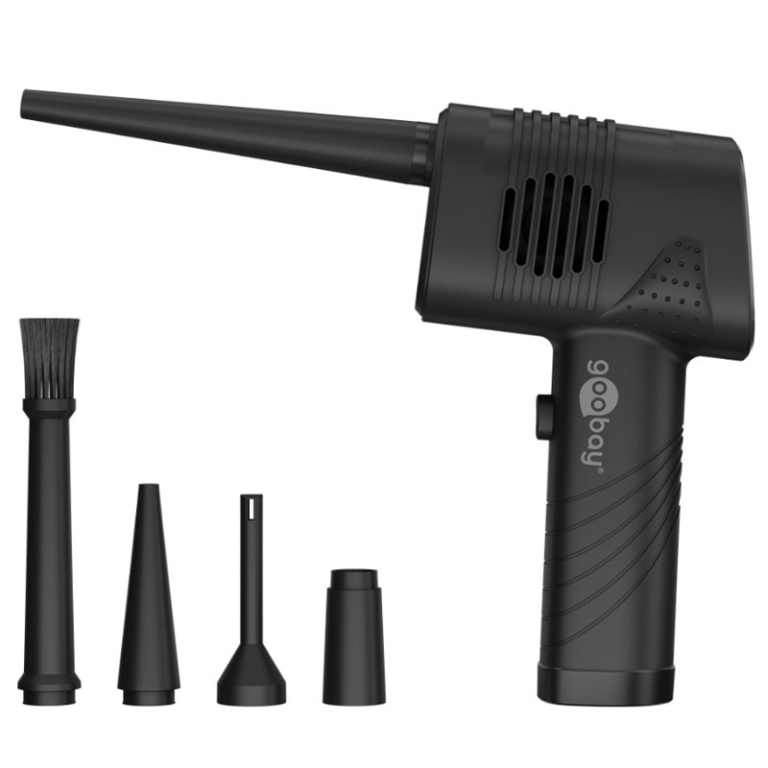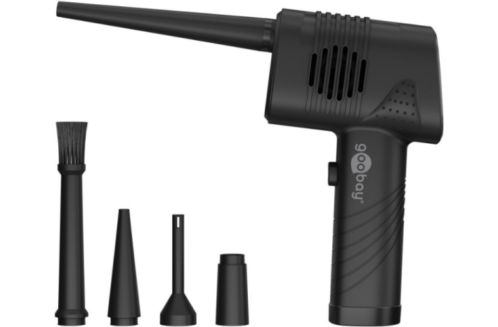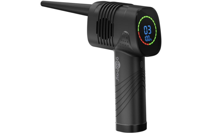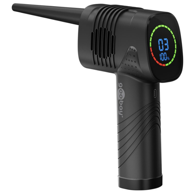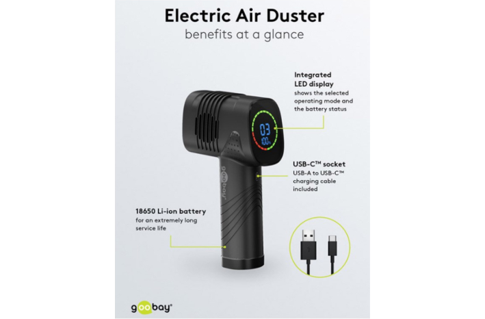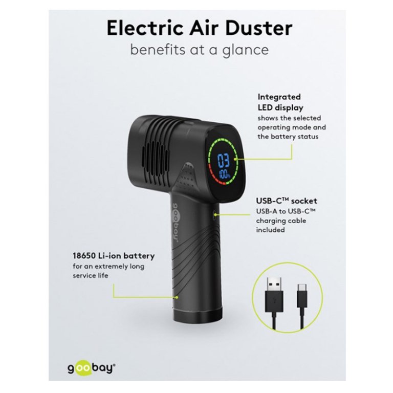 Puhalnik prahu ima 3 stopnje moči z do 35.000 vrt./min pri 2.000 mAh in do 90 min. delovanja. Vgrajen LED zaslon prikazuje izbrani način delovanja in stanje baterije. Čistilec tipkovnice je opremljen z visokokakovostnimi Li-ion baterijami 18650 za izjemno dolgo življenjsko dobo.