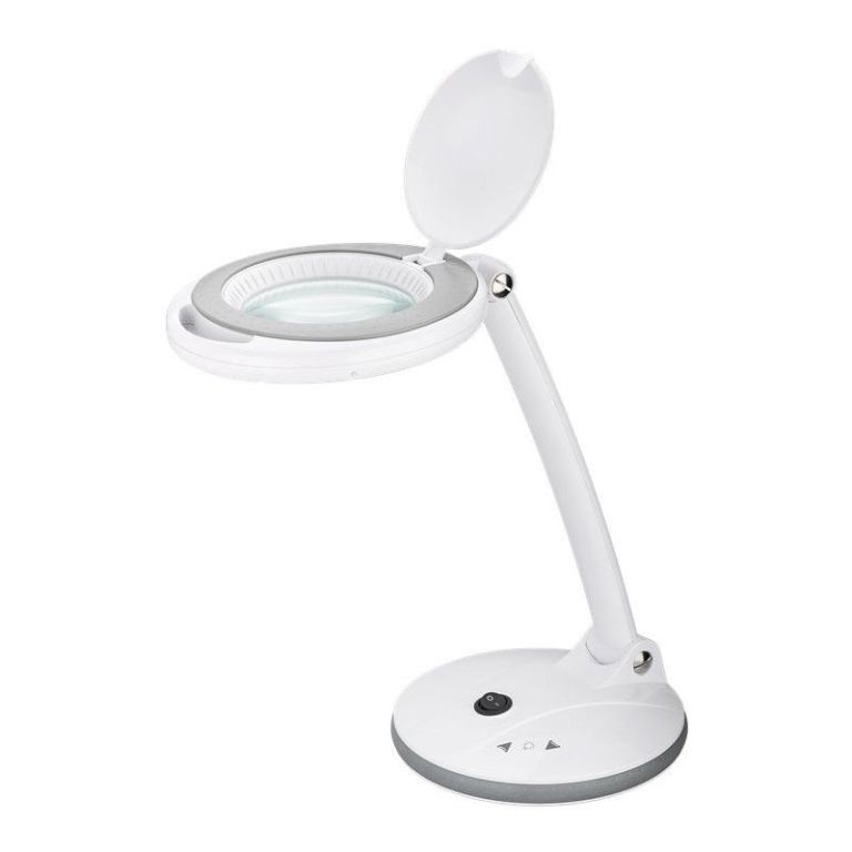 GOOBAY povečevalna LED namizna svetilka nudi povečevalno lupo v premeru 100 mm z LED osvetlitvijo obroča. Steklena leča ima 3 dioptrije, nudi 1,75x povečevanje in ima zaščitni pokrov. Nosilec svetilke z integriranim kablom ima delovni polmer 330 mm in se lahko nagiba do 90°. Postavek svetilke je gumiran za bolj stabilno postavitev. Svetilnost svetilke lahko preko stikala na dotik po korakih nastavimo od 80 do 400 lumnov. Zamenjava leče je izredno preprosta.