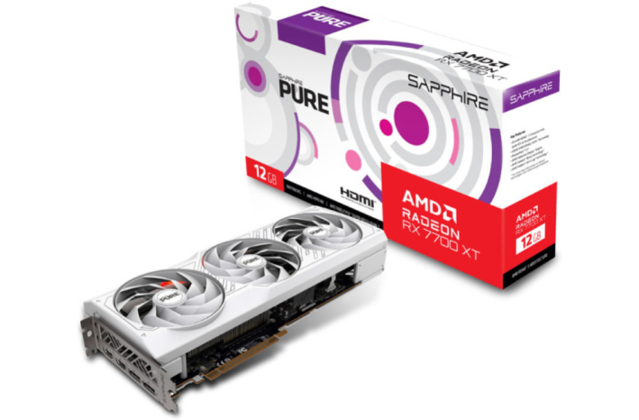 Sapphire PURE Radeon RX 7700 XT. Družina grafičnega procesorja: AMD, GPU: Radeon RX 7700 XT. Pomnilnik diskretne grafične kartice: 12 GB, Vrsta pomnilnika grafične kartice: GDDR6, Širina pomnilniškega vmesnika: 192 bitov. Največja ločljivost: 7680 x 4320 slikovnih pik. Različica DirectX: 12 Ultimate. Vmesnik: PCI Express x16 4.0. Hlajenje: Aktivno, Število ventilatorjev: 3 ventilatorji, Barve osvetlitve: Rdeča.
