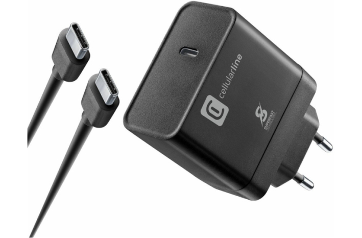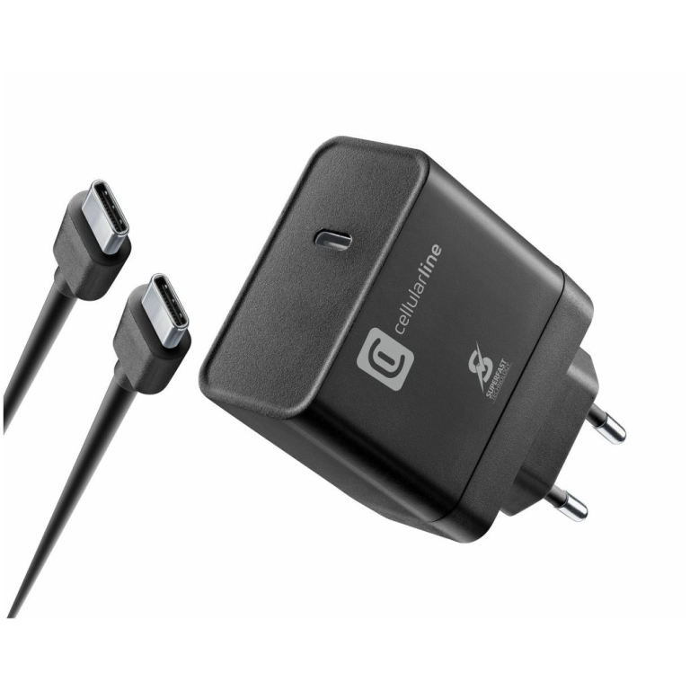 Hišni polnilec 100-240V => 1x USB-C 65W CellularLine + kabel C-C črn (ACHKIT65WC2CTABK)
