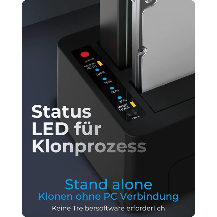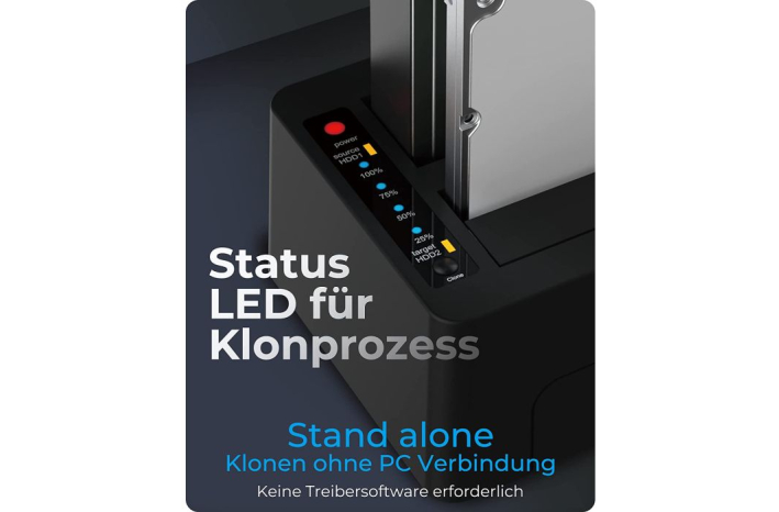 IB-1232CL-U3 je dvorežna Docking & Clone postaja za 2,5" in 3,5" SATA diske, ki omogoča samostojno kloniranje brez računalnika. V SINGLE načinu računalnik zazna vsak disk posebej, USB 3.0 z UASP podporo pa zagotavlja hitre prenose do 5 Gbit/s. Podpira HotSwap in Plug & Play, LED indikatorji pa prikazujejo napajanje, dostop in napredek kloniranja. Primerna je za hitro nadgradnjo in varnostne kopije.
