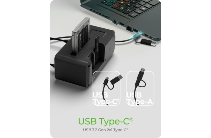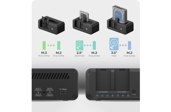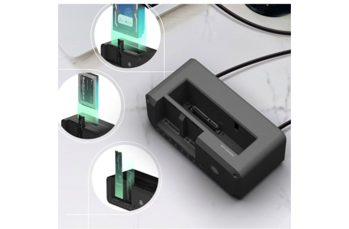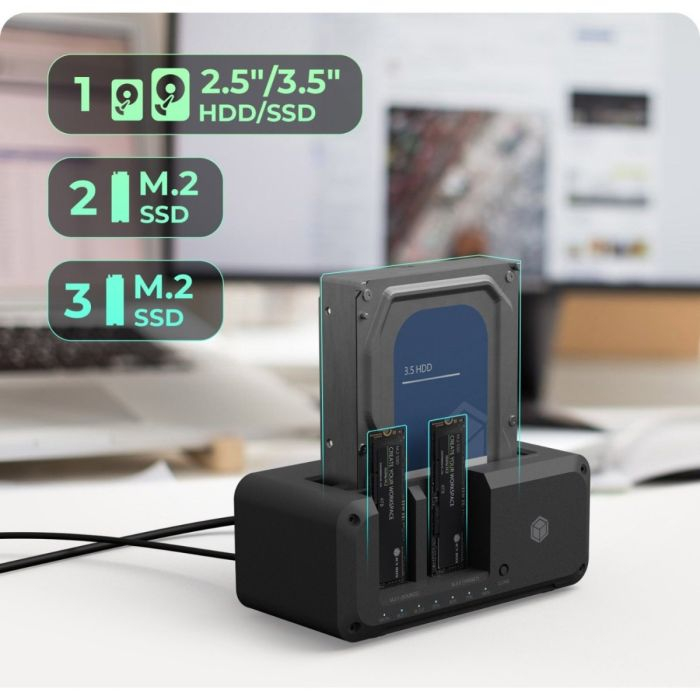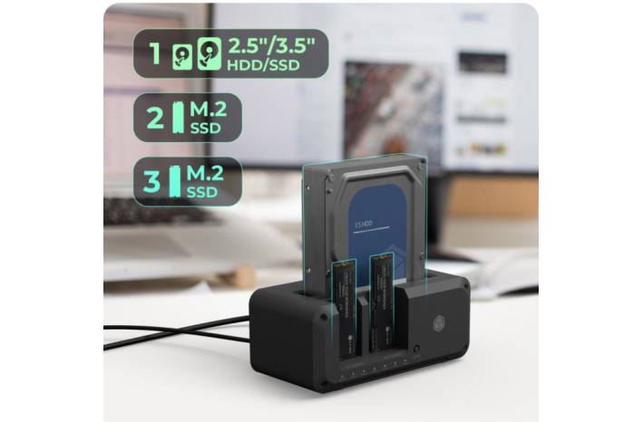 Naprava IB‑2924MSCL‑C31 združuje kloniranje, priklop in prenos podatkov v eni enoti. Lahko vstavite običajen 2,5" ali 3,5" SATA HDD ali SSD disk, ali enega izmed dveh M.2 NVMe modulov. Kloniranje poteka brez računalnika, s pritiskom na gumb (offline kloniranje), LED indikatorji kažejo napredek. Za povezavo se uporablja USB‑C ali USB‑A kabel s podporo za USB 3.1 / USB 3.2 Gen2 do 10 Gbit/s. Idealen za tehnike, serviseje, fotografe, urejevalce podatkov ali vsakogar, ki potrebuje hitro in zanesljivo rešitev za kloniranje ali dostop do več diskov.