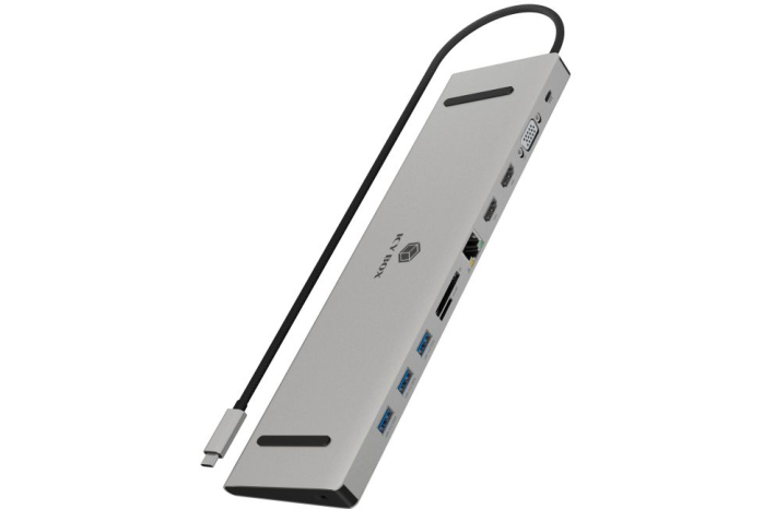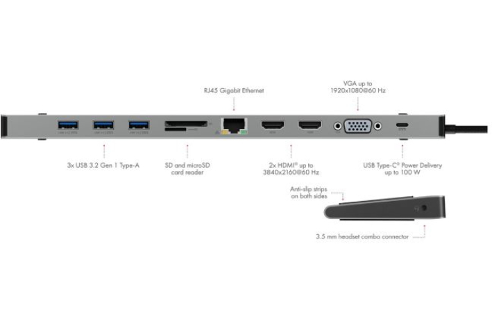 IB-DK2106a-CPD je 3-v-1 USB-C priklopna postaja z dvema HDMI izhodoma do 4K@60 Hz in VGA izhodom do 1080p@60 Hz. Omogoča hkratno uporabo dveh zaslonov, hitro prenašanje podatkov prek treh USB-A 3.0 priključkov ter branje SD/microSD kartic do 100 MB/s. Gigabit LAN, avdio vhod/izhod in Power Delivery do 100 W zagotavljajo popolno funkcionalnost v kompaktni aluminijasti zasnovi.