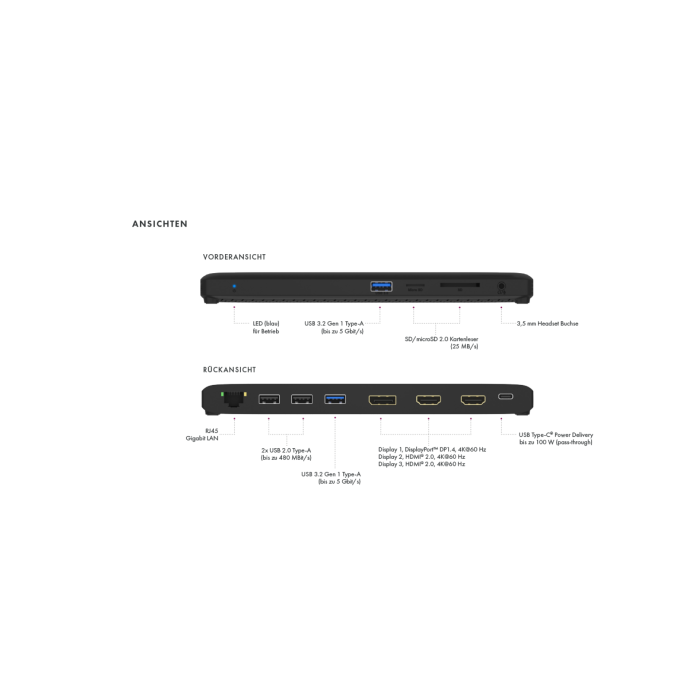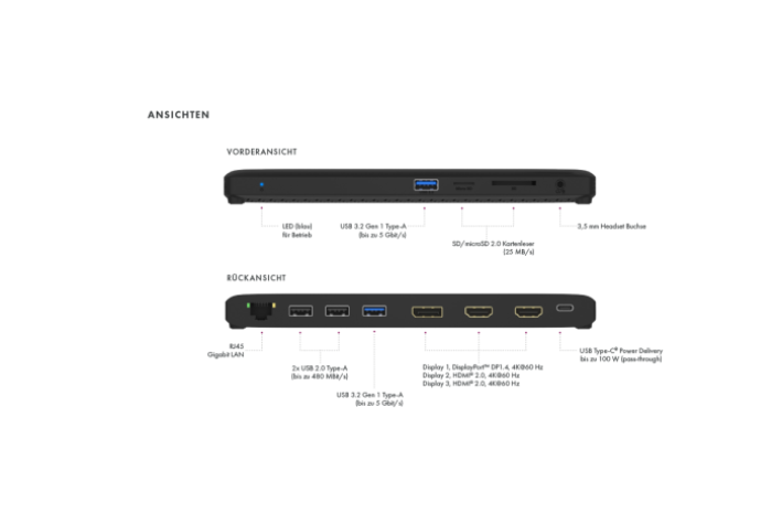 Ta priključna postaja ponuja številne priključke, kar omogoča večjo funkcionalnost in prilagodljivost vašemu delovnemu okolju. Vključuje: