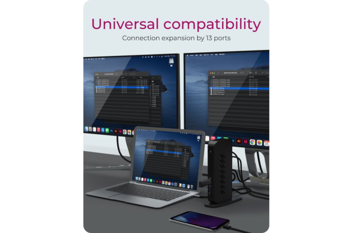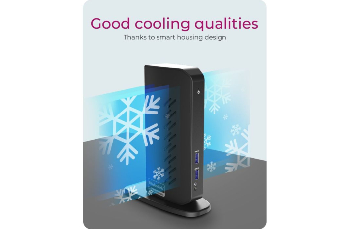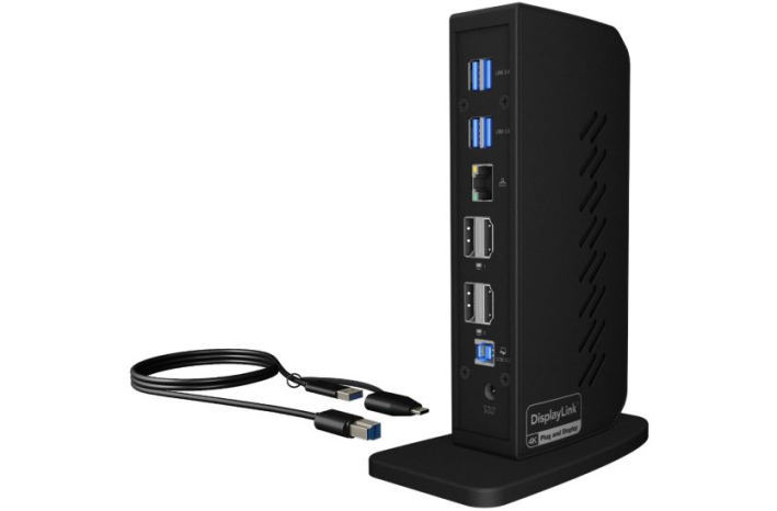 Docking postaja ICYBOX IB‑DK2252AC je vsestranska rešitev, ki vaš prenosnik ali tablico povzdigne na nivo polne delovne postaje. Poveže se prek USB–C (DisplayLink) in priključi do treh zaslonov (2× HDMI in 2× DisplayPort), omogoča priklop periferije prek šestih USB 3.0 vrat, zagotavlja stabilno omrežno povezavo prek RJ‑45 Gigabit Ethernet porta in podpira polnjenje do 65 W prek USB‑C Power Delivery. Vertikalni dizajn z robustnim stojalom prihrani prostor na mizi in omogoča naravno hlajenje. Vključuje 3,5 mm avdio priključek za slušalke/mikrofon in USB‑B posredniški vmesnik. Plug‑and‑play delovanje je podprto na Windows, macOS in ChromeOS — idealen za pisarne, domačo postavitev ali napredne IT rešitve.
