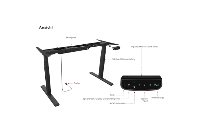 Študije kažejo, da prehod s sedečega na stoječe delo prinaša več koristi za zdravje in lahko poveča produktivnost. Z IB-EW205B-T lahko zdaj z lahkoto dosežete popolno ravnovesje med sedenjem in stanjem ves delovnik ter integrirate vaše obstoječe namizne plošče. Dva motorja za brezhibno nastavitev višine s hitrostjo dviganja do 38 mm na sekundo omogočata gladko, stabilno in tiho delovanje. 3-stopenjske raztegljive noge za mizo omogočajo preprost prehod iz sedečega v stoječi položaj s pritiskom na gumb. 3 prilagodljive pomnilniške nastavitve shranijo vaše želene višine, upravljalna enota nudi tudi samodejne opomnike za preklop med stoječim in sedečim položajem za redno vadbo.