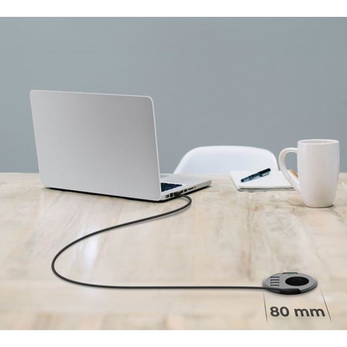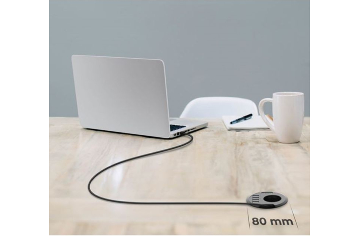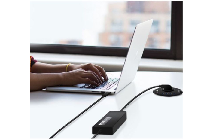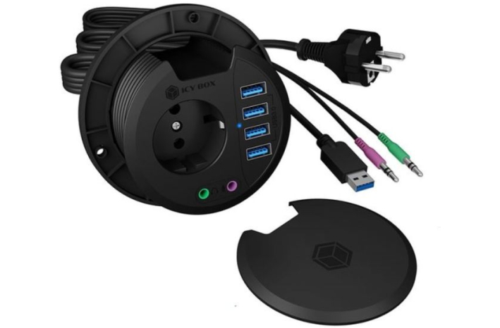 IB-HUB1430 je diskreten USB hub, ki omogoča urejeno delovno okolje in hiter dostop do priklopov na mizi. Ponuja štiri USB 3.2 Gen 1 Type-A porte s hitrostjo do 5 Gbit/s, dodatno EU 230 V vtičnico ter dva 3,5 mm avdio priključka. Vgradi se v standardno 80 mm odprtino, vključuje dolg integriran kabel ter je primeren za mize debeline do 45 mm.