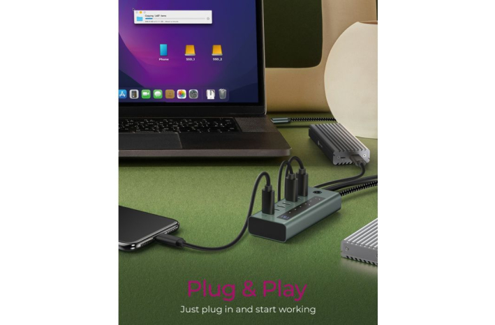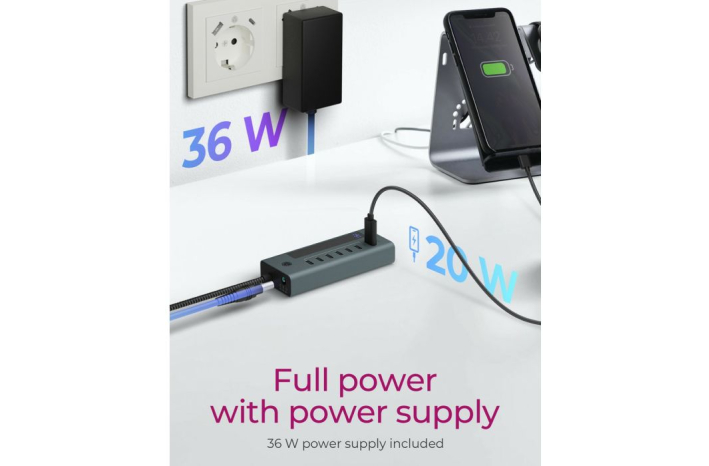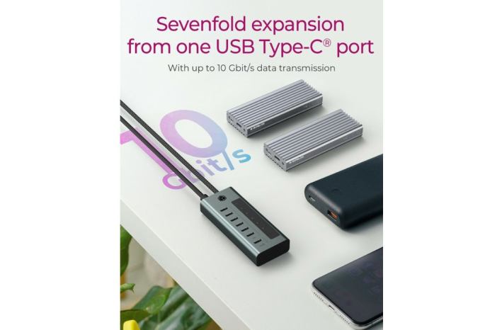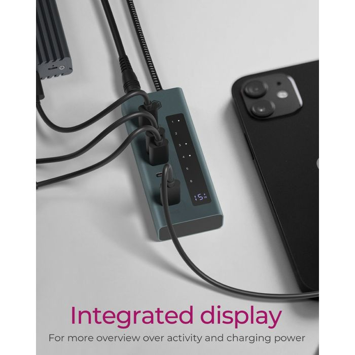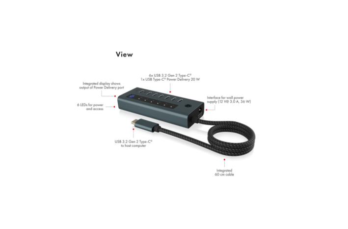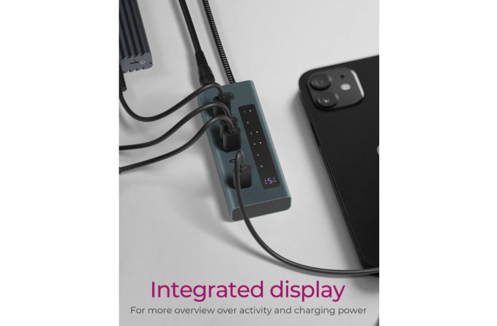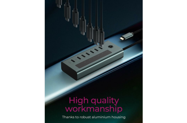 IB-HUB1457-C31 je 7-portni USB-C hub z USB 3.2 Gen 2 hitrostmi do 10 Gbit/s. Šest priključkov služi za podatke, en pa omogoča polnjenje naprav do 20 W. Vgrajen zaslon prikazuje stanje posameznih portov in moč polnjenja. Integriran USB-C kabel dolžine 60 cm ter aluminijasto ohišje zagotavljata kakovost, priloženi napajalnik pa stabilno delovanje vseh priključkov hkrati.