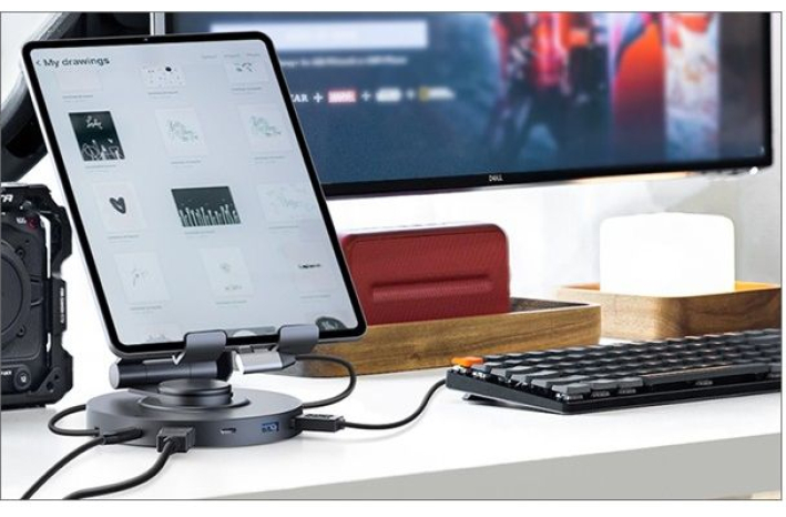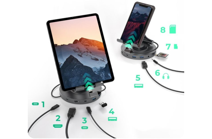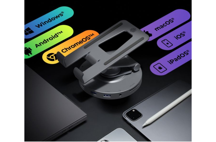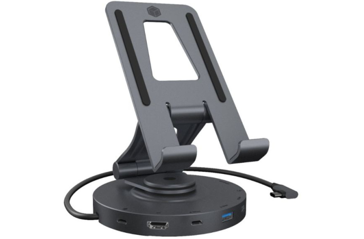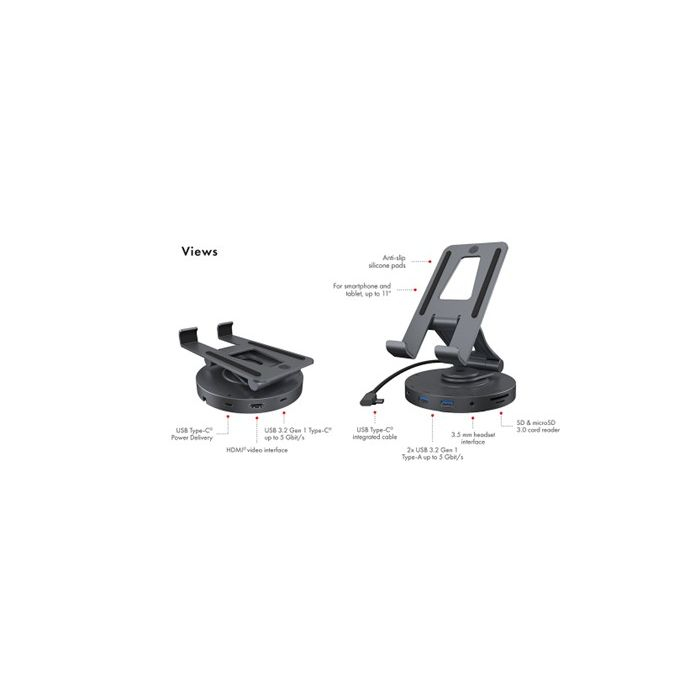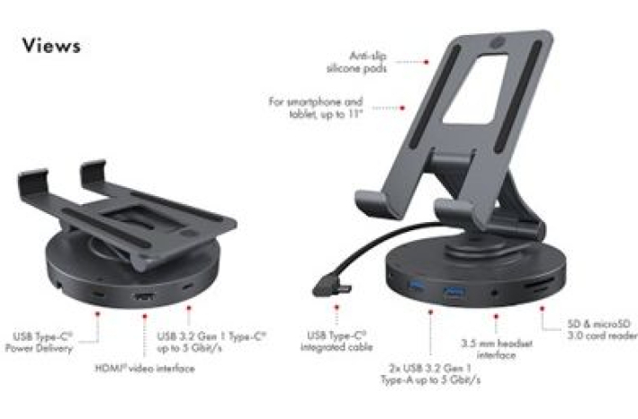 Uživajte v udobnem delovnem okolju z zmogljivostjo vaše tablice ali pametnega telefona. Nosilec podpira naprave do velikosti 11 palcev in omogoča nastavljanje naklona, da ga lahko prilagodite svojim potrebam. Zaradi širokih in zmogljivih možnosti povezljivosti lahko na nosilec povežete zunanje zaslone ter svojo tablico ali pametni telefon uporabljate kot popolnoma funkcionalen računalnik. Uživajte v udobju večzaslonskega delovnega okolja. Model IB-TH100-DK je idealno središče za hibridno delovno okolje. Prek HDMI 2.0 priključka lahko povežete pametni telefon ali tablico z dodatnim monitorjem v ločljivosti do 4K pri 60 Hz. Zaradi izjemno kompaktne oblike je nosilec zelo prenosljiv in vam omogoča svobodo dela kjerkoli, hkrati pa ponuja izkušnjo podobno delu na prenosniku.