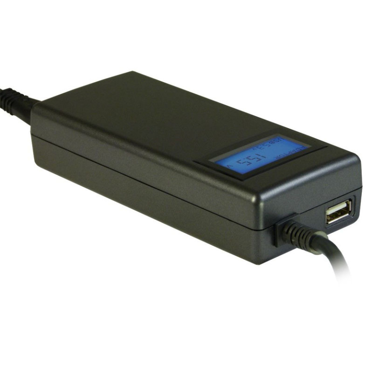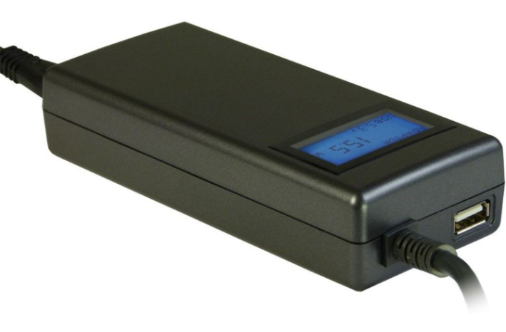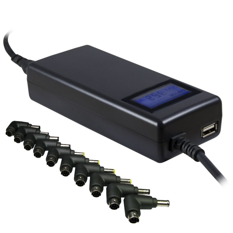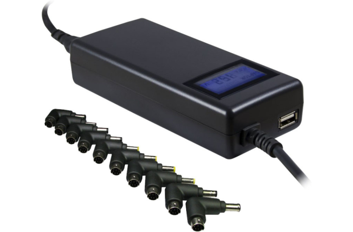 Napajalnik za prenosnike z močjo 90W in 10 različnimi nastavki. Omogoča samodejno spreminjanje napetosti in ima USB izhod za polnjenje drugih naprav.