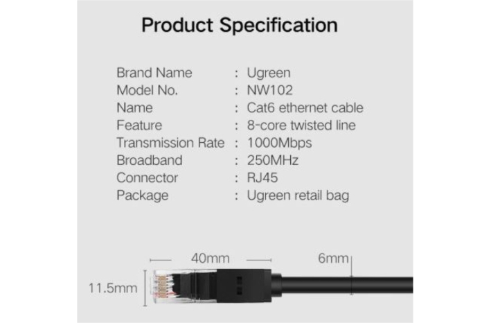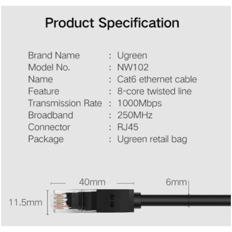 Ugreen Cat6 UTP LAN mrežni kabel. Za priklop sta na voljo 2 RJ45 moška konektorja z visoko kvalitetnim PVC ovojem.