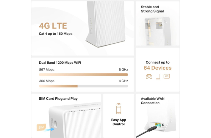 MB130-4G, ki deluje kot usmerjevalnik 4G, uporablja tehnologijo 4G LTE za doseganje izjemno hitrih hitrosti do 150 Mbps prenosa in 50 Mbps nalaganja. Prav tako lahko deli dvopasovno omrežje Wi-Fi s hitrostmi 867 Mbps na 5 GHz za naloge, ki zahtevajo veliko pasovno širino, kot so pretakanje HD-ja in igranje iger, ter 300 Mbps na 2,4 GHz za brskanje po internetu, e-pošto in družbena omrežja.