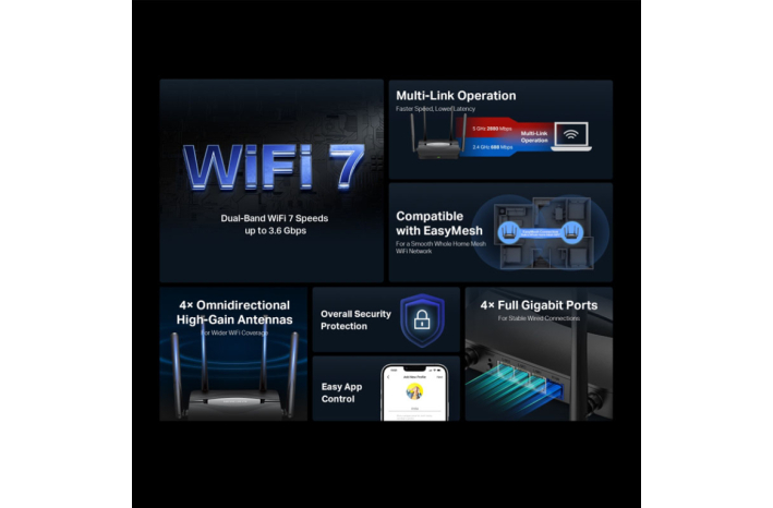 - Najnovejši WiFi 7: Opremljen s 160 MHz kanali, 4K-QAM, MLO in drugimi funkcijami, ki jih ponuja WiFi 7, bo vaše omrežje prišlo z osupljivo zmogljivostjo.