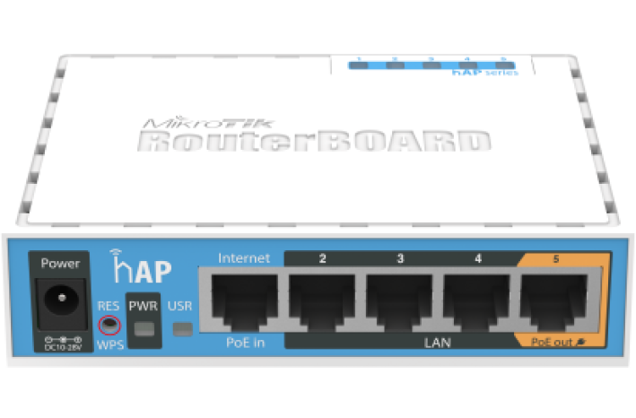 hAP zagotavlja izhodno funkcijo PoE za vrata #5 - lahko napaja druge naprave, ki podpirajo PoE, z enako napetostjo, kot je priključena na enoto. Največja obremenitev vrat je 500 mA.