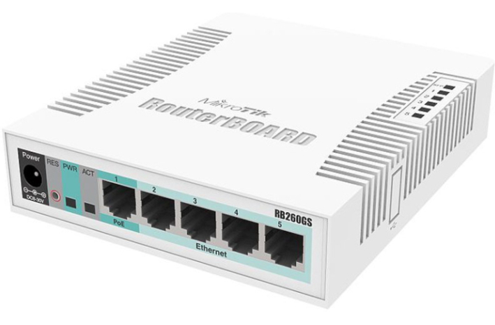 RB260GS je majhno stikalo SOHO. Ima pet gigabitnih Ethernet vrat in eno SFP kletko, ki jo poganja Atheros Switch Chip.