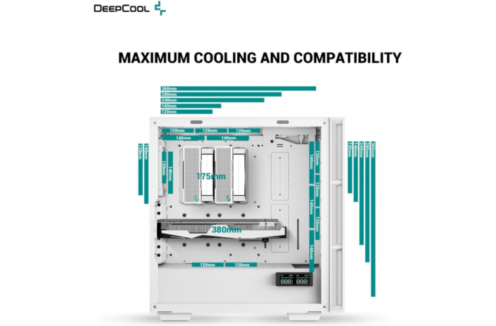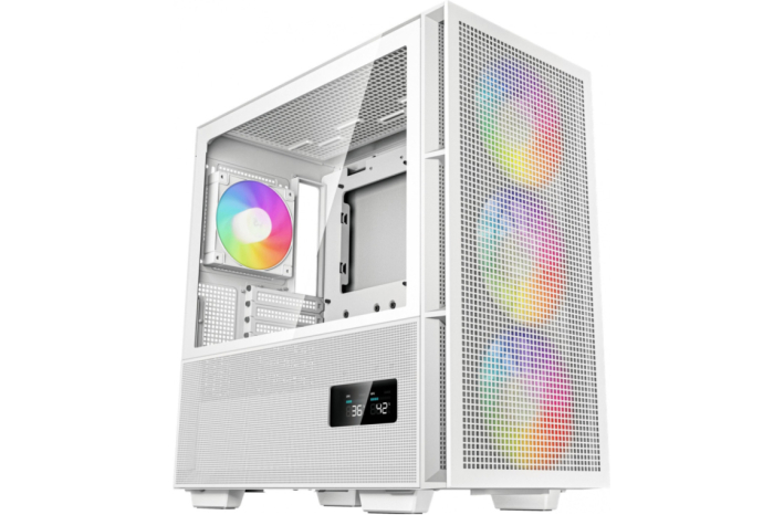 DeepCool CH560 DIGITAL WH. Faktor oblike: Midi Tower, Tip: PC, Barva izdelka: Bela. Postavitev napajalnika: Tla, Podprti faktorji oblike napajalnika: ATX, PS2. Nameščeni ventilatorji (spredaj): 3x 140 mm, Premer podprtih sprednjih ventilatorjev: 120.140 mm, Nameščeni ventilatorji zadaj: 1x 120 mm. Podprte velikosti trdih diskov: 2.5,3.5". Širina: 230 mm, Globina: 458 mm, Višina: 471 mm.