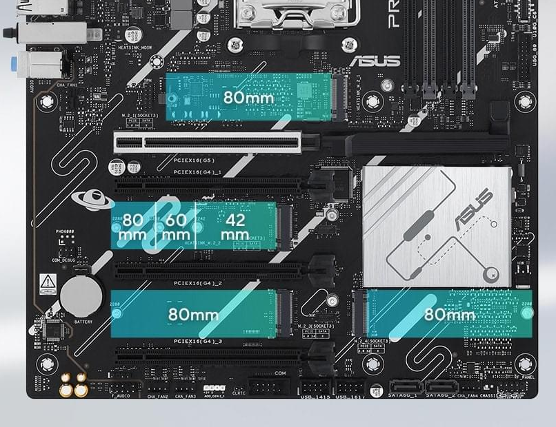 PRIME X870-P WIFI ponuja skupno štiri reže M.2, vključno z eno, ki podpira hitrosti prenosa podatkov do 128 Gbps prek PCIe 5.0, dvema, ki podpirata 64 Gbps prek PCIe 4.0, in eno, ki podpira PCIe 3.0. To omogoča hitrejši čas zagona in nalaganja aplikacij z OS ali pogoni aplikacij.