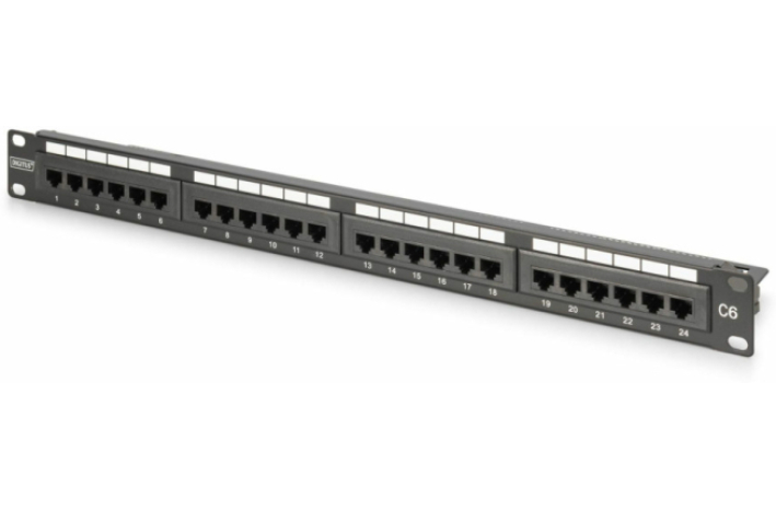Digitus panel CAT6 24-P za montažo v komunikacijsko omaro, 24-portni RJ45, 8P8C, LSA, 1U, montaža v rack, material jeklo, črna barva.