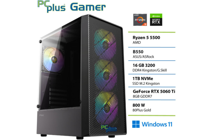 PCPLUS Gamer Ryzen 5 5500 16GB 1TB GeForce RTX 5060 Ti 8GB Windows 11 Home gaming namizni računalnik