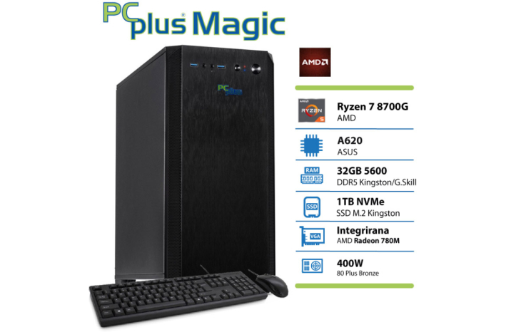 PCPLUS Magic je opremljen z močnim osemjedrnim AMD procesorjem Ryzen 7 8700G, ki zagotavlja brezhibno delovanje in hitro odzivnost pri več nalogah hkrati. Integrirano grafično jedro Radeon 780M omogoča gladko izvajanje multimedijskih vsebin in iger.