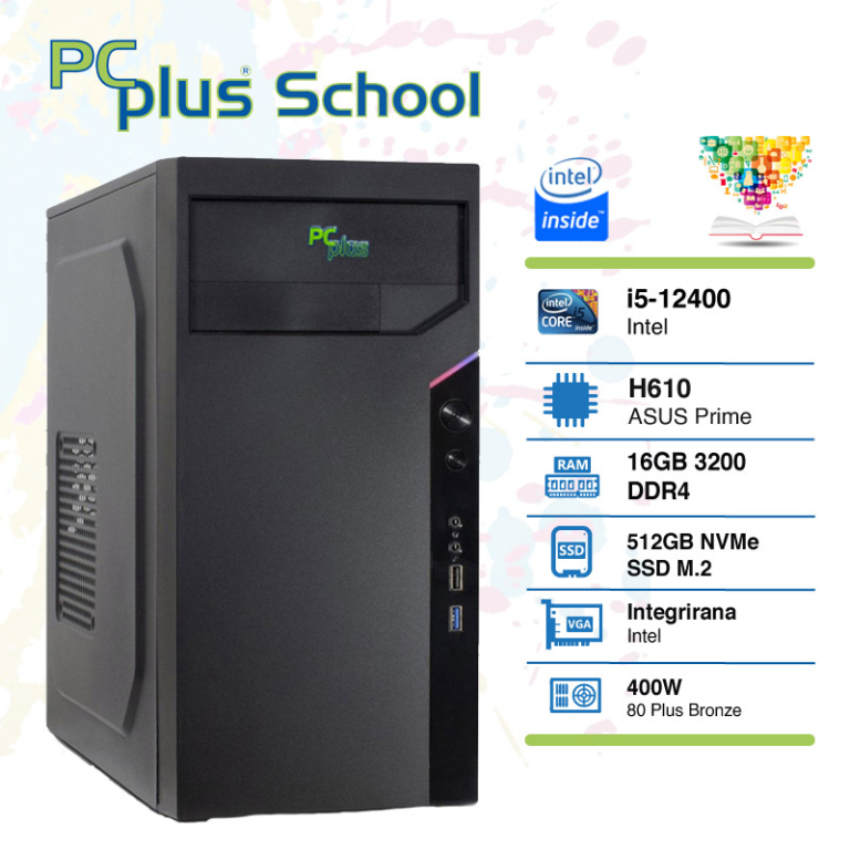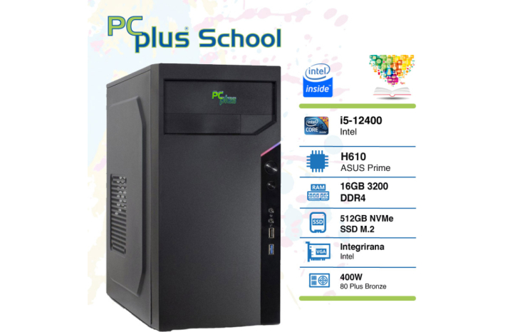 PCPLUS School i5-12400 16GB 512GB NVMe SSD Windows 11 PRO EDU namizni računalnik je idealna izbira za zahtevne izobraževalne programe. Z Intel Core i5-12400 procesorjem in 16GB pomnilnika bo delo potekalo brezhibno.