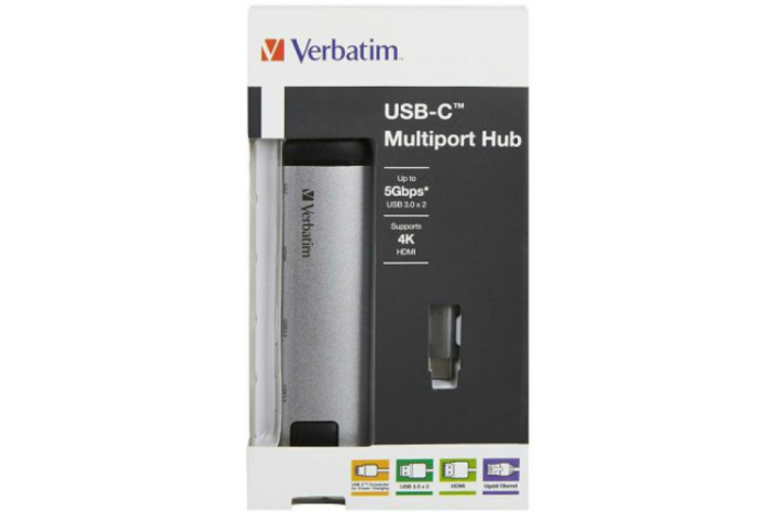 Verbatim 49141. Gostiteljski vmesnik: USB 3.2 Gen 1 (3.1 Gen 1) Type-C, Vmesniki vozlišča: USB 3.2 Gen 1 (3.1 Gen 1) Type-C. Hitrost prenosa podatkov: 1000 Mbit/s, Barva izdelka: Črna, Srebrna, Material ohišja: Kovina. Vrsta vmesnika Ethernet: Gigabit Ethernet. Vhodna napetost: 5-20V Vhodni tok: 3A Širina: 30 mm Globina: 115 mm Višina: 15,3 mm