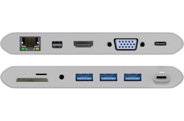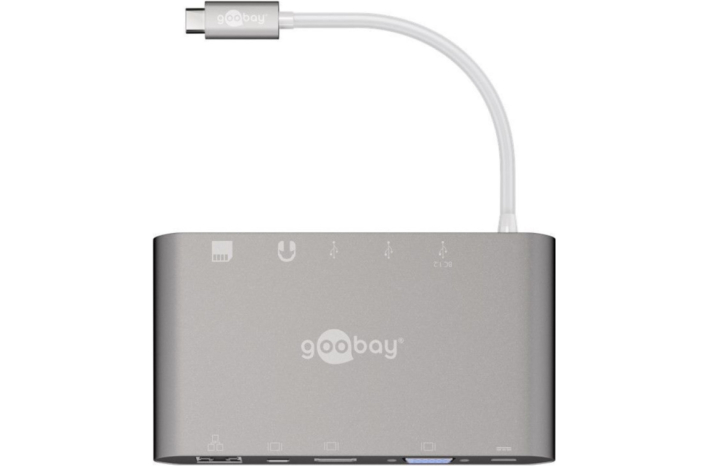 GOOBAY USB-C multi adapter / Dock postaja doda USB-C napravi naslednje priključke: mrežni priključek, HDMI, VGA, mini DisplayPort, 3x USB 3.0, 3,5 mm priključek in režo za SD / micro SD kartico.