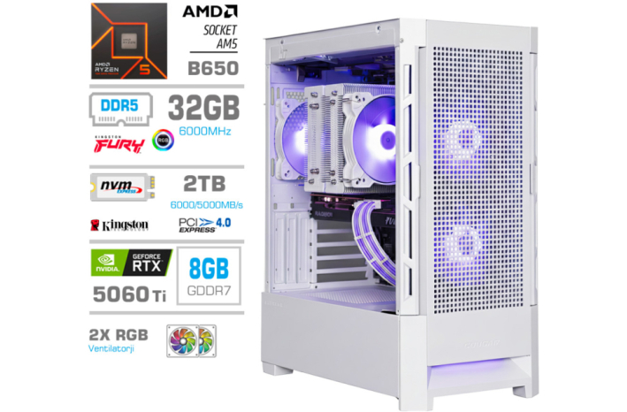 Računalnik MEGA MT S8 R5-9600X/RTX5060Ti/32GB-DDR5/2TB-4.0/750W/Brez OS/bela RGB