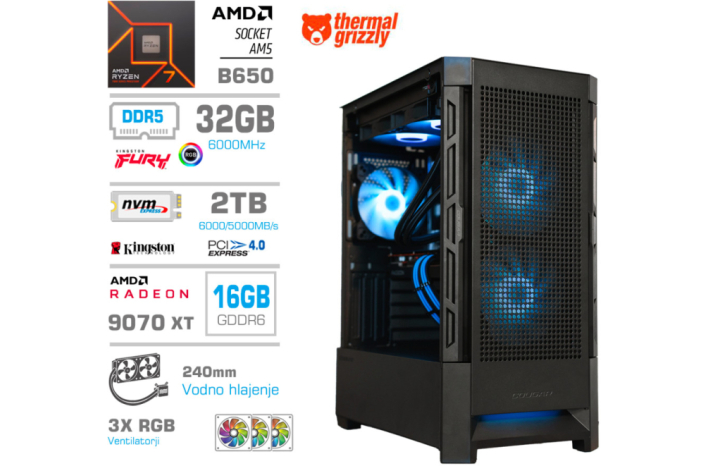 Računalnik MEGA MT S8 R7-7700X/RX9070 XT/32GB-DDR5/2TB-4.0/750W/Brez OS/črna RGB + Estetski napajalni kabli [Modra / Črna]