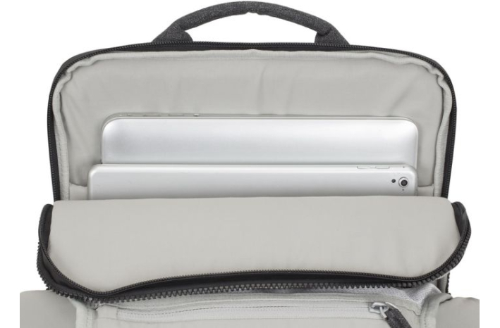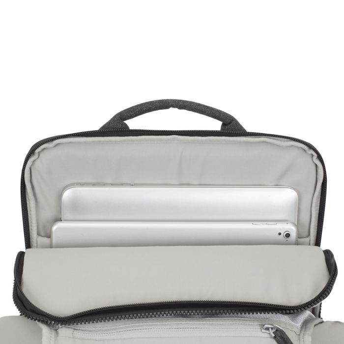 •Idealno za poslovna potovanja • Izdelano iz visokokakovostnega umetnega usnja in trendovske melange tkanine iz trpežnega poliestra za zaščito prenosnika pred občasnimi udarci in praskami, pa tudi pred prahom in vlago. • Prostor za prenosnike z vodoodporno zadrgo, oblazinjenimi stranicami in žepom za tablico do 10 je v notranjosti dodatno zaščiten z oblazinjenim vložkom na dnu. • Sprednji žep z zadrgo je namenjen shranjevau vaše dodatne opreme, predalčke, vizitke, pisala in pametne telefone. • Stranski predal z zadrgo z žepom za dokumente, dva žepa z zadrgo in žep za steklenico ali dežnik. • Udobni mehki ročaj in naramnice z mehkanimi trakovi bodo poskrbeli za udobje tudi med najdaljšo potjo • Trak z vozičkom s skritim žepom z zadrgo za potni list in denarnico enostavno pritrdi nahrbtnik na kovček • Velcro sistem za upravljanje trakov čvrsto pritrdi odvečne trakove, kar ustvarja novo dimenzijo udobja in varnosti.