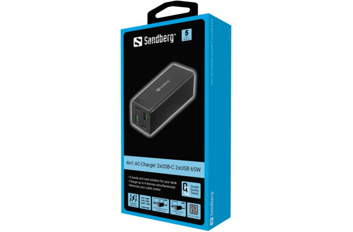 Sandberg 4 v 1 Charger 2xUSB-C in 2xUSB 65W je priročni napajalnik za vašo pisalno mizo. Z njim lahko napajate svoj prenosnik in mobilno opremo.