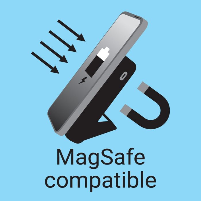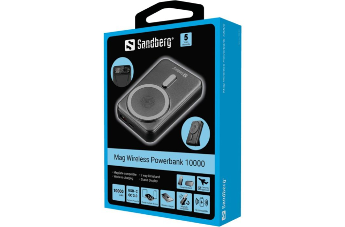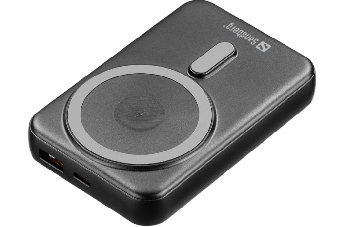 Prenosna baterija Sandberg Magnet Wireless Powerbank 10000 mAh je zelo pametna prenosna baterija z naborom funkcij polnjenja. Pametne telefone, skladne s standardom Qi lahko polnite popolnoma brezžično, ko telefon položite na polnilni podstavek na prenosni bateriji. Polnilna plošča je magnetna, zato lahko nanjo namestite tudi telefone iPhone, ki podpirajo funkcijo MagSafe. Opremljena je tudi z izhodom USB-C za hitro polnjenje naprav vse do 22,5 W in izhodom USB-A z 10 W. Pametni LCD zaslon prikazuje status baterije.
