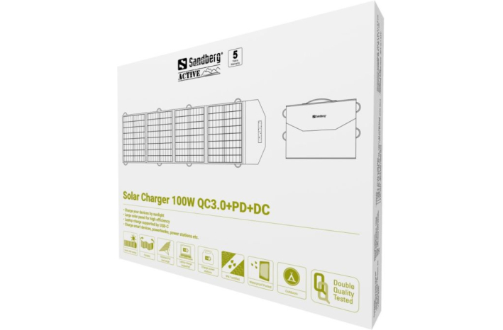 Podatki o pakiranju: 1x Sandberg Solar Charger 100W QC3.0+PD+DC, 1x kabel DC5525 – DC5525 (3 m), 1x navodila za uporabo