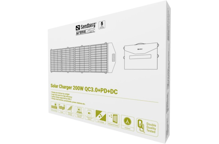 Podatki o pakiranju: 1x Sandberg Solar Charger 200W QC3.0+PD+DC, 1x kabel DC5525 – DC5525 (3 m), 1x navodila za uporabo