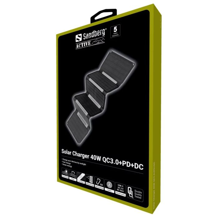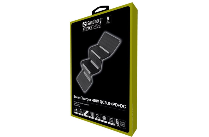 Sandberg Solar Charger 40W QC3.0+PD+DC je kompakten in zmogljiv solarni kolektor, ki se odpre v 6 monokristalnih solarnih plošč, ki dosežejo skupno zmogljivost do 40 W. Na krmilni omarici solarnega kolektorja najdete 3 hitre vhode (USB-A s podporo za QC 3.0, USB-C, DC 5521). Tako prinaša široko povezljivost z optimalno hitrostjo polnjenja pametnih telefonov, tabličnih računalnikov, prenosnih baterij in podobno. Priložena zaponke lahko med vašimi pustolovščinami uporabite za pritrditev solarnega kolektorja na nahrbtnik. Zelena energija za vašo opremo!
