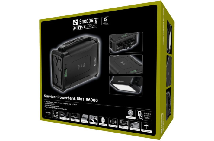 Sandberg Survivor Powerbank 8in1 96000 mAh je popolna polnilna postaja za praktično vse vaše naprave. Ogromna baterija z 96000 mAh je sama po sebi dovolj, da z njo napolnite svoj pametni telefon vsak dan skoraj ves mesec. Zgrajena je iz robustnega materiala, odpornega na vodo. Prenosna baterija je primerna tako za pustolovščine v divjini kot za prodajnika na terenu, ki potrebuje veliko moči za svoje naprave.