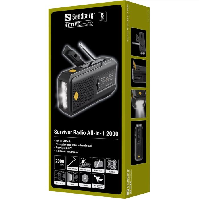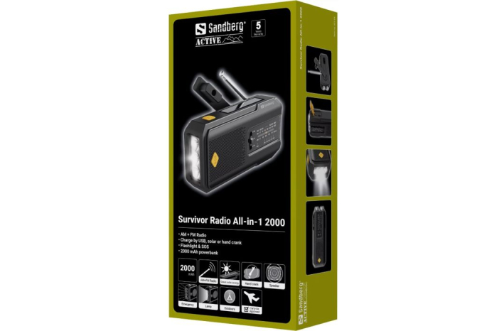 Sandberg Survivor Radio All-in-1 2000 radijski sprejemnik za preživetje je kompaktna in robustna naprava, ki vsebuje obilico pametnih funkcij, uporabne na prostem, v naravi ali v primeru izrednih razmer. Z izdelkom dobite prenosno baterijo za polnjenje pametnega telefona, zvočnik, radio s sprejemom AM in FM ter funkcionalnost svetilke - deluje lahko kot baterijska svetilka ali kot bralna luč. Napravo lahko polnite prek standardnega vira USB, ko pa niste v bližini električnega omrežja, lahko za polnjenje v primeru sile uporabite vgrajeno solarno ploščo ali priloženo ročico.