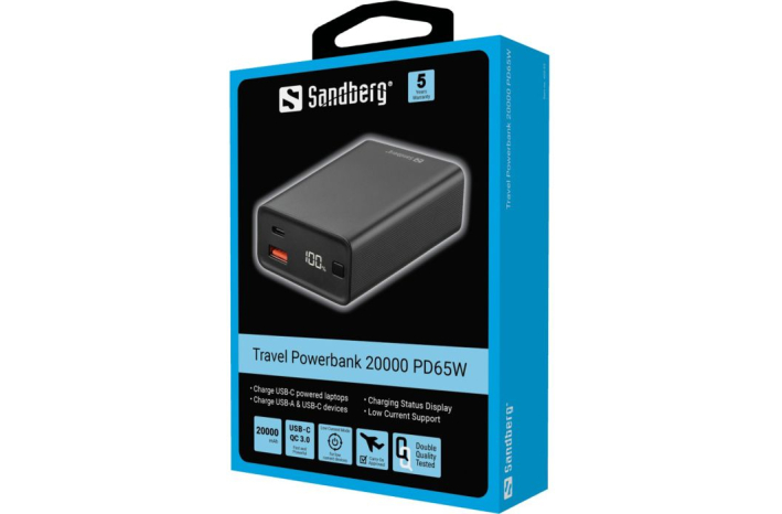 Podatki o pakiranju: 1x Sandberg Travel Powerbank 20000 PD65W, 1x USB-C na USB-C kabel 100W (50 cm), 1x navodila za uporabo, 1x varnostna navodila GPSR