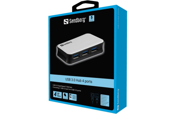 Sandberg USB 3.0 Hub 4 ports vozlišče omogoča priklop več USB naprav na vaš računalnik. Vozlišče priključite s priloženim kablom, operacijski sistem Windows pa samodejno namesti potrebno programsko opremo.