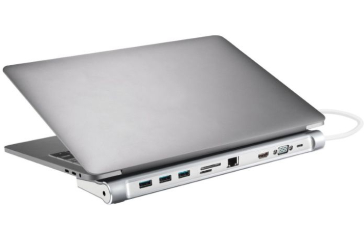 Priključki: 1× USB-C (ženski, za napajanje do 100 W), 1× USB-C (ženski, za prenos podatkov), 1× HDMI (ženski), 1× VGA (ženski), 3× USB 3.0 A (ženski), 1× RJ45 (ženski), 1× zvočni izhod, 1× reža za SD kartice (SD/SDHC/SDXC/MMC), 1× reža za Micro SD/TF kartice